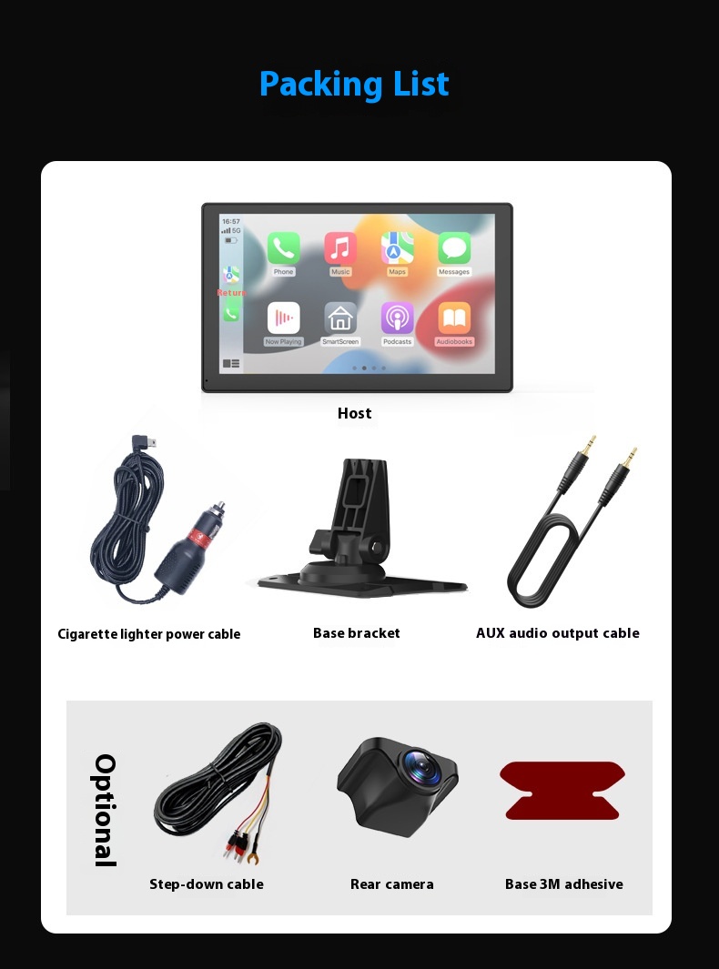 Host, cigarette lighter power cord, base bracket, AUX audio output cable, rear camera*1set