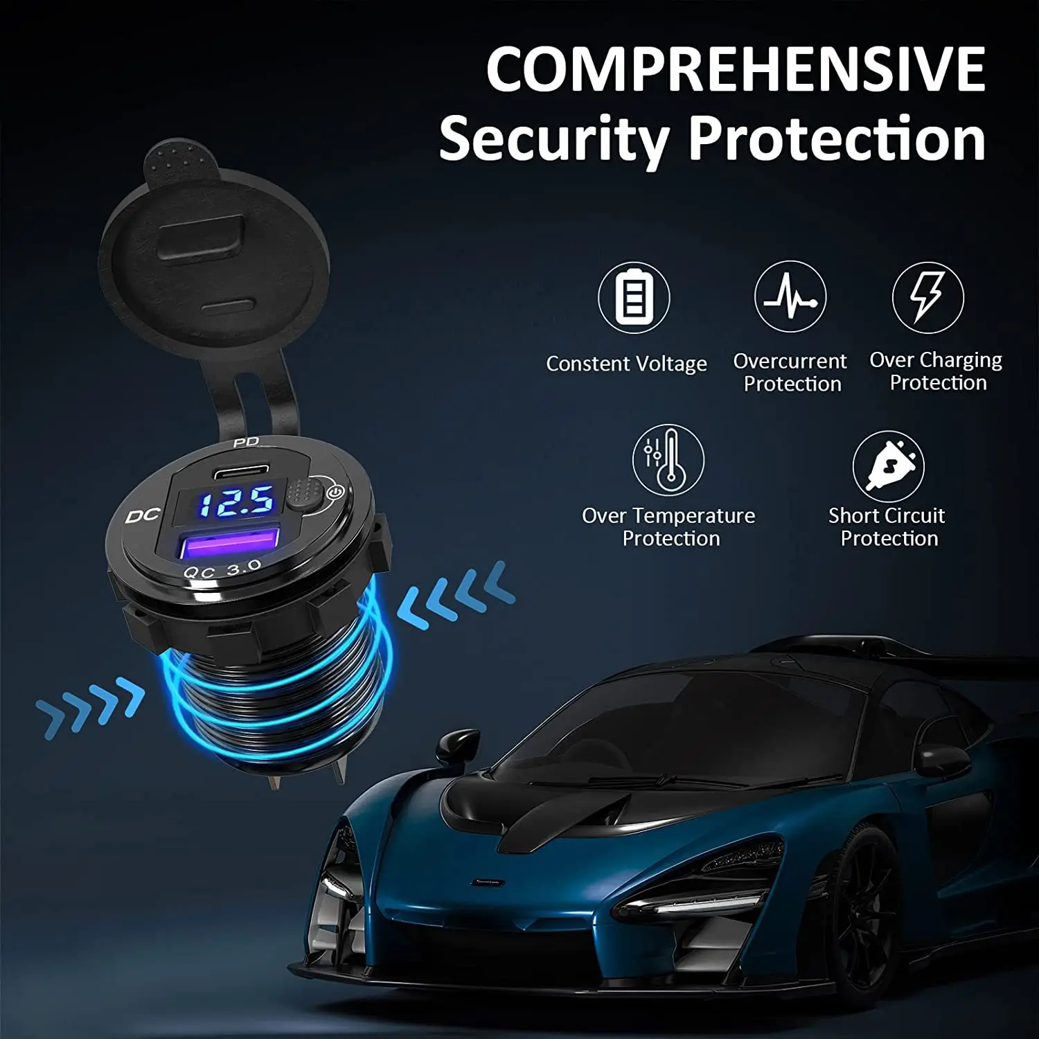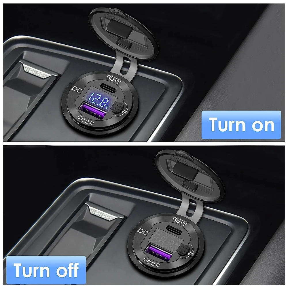 83W USB C Car Charger Socket 12/24V Outlet Laptop Fast Charging 65W PD3.0 & QC3.0 with Digital Display for Car RV ATV Motorcycle