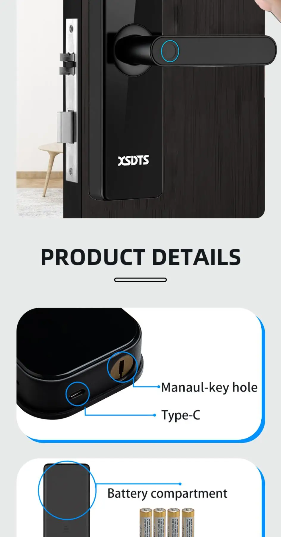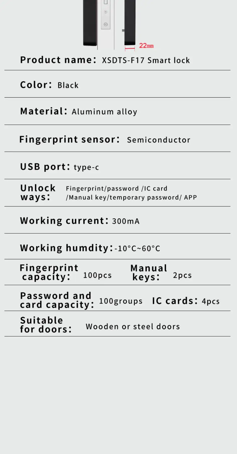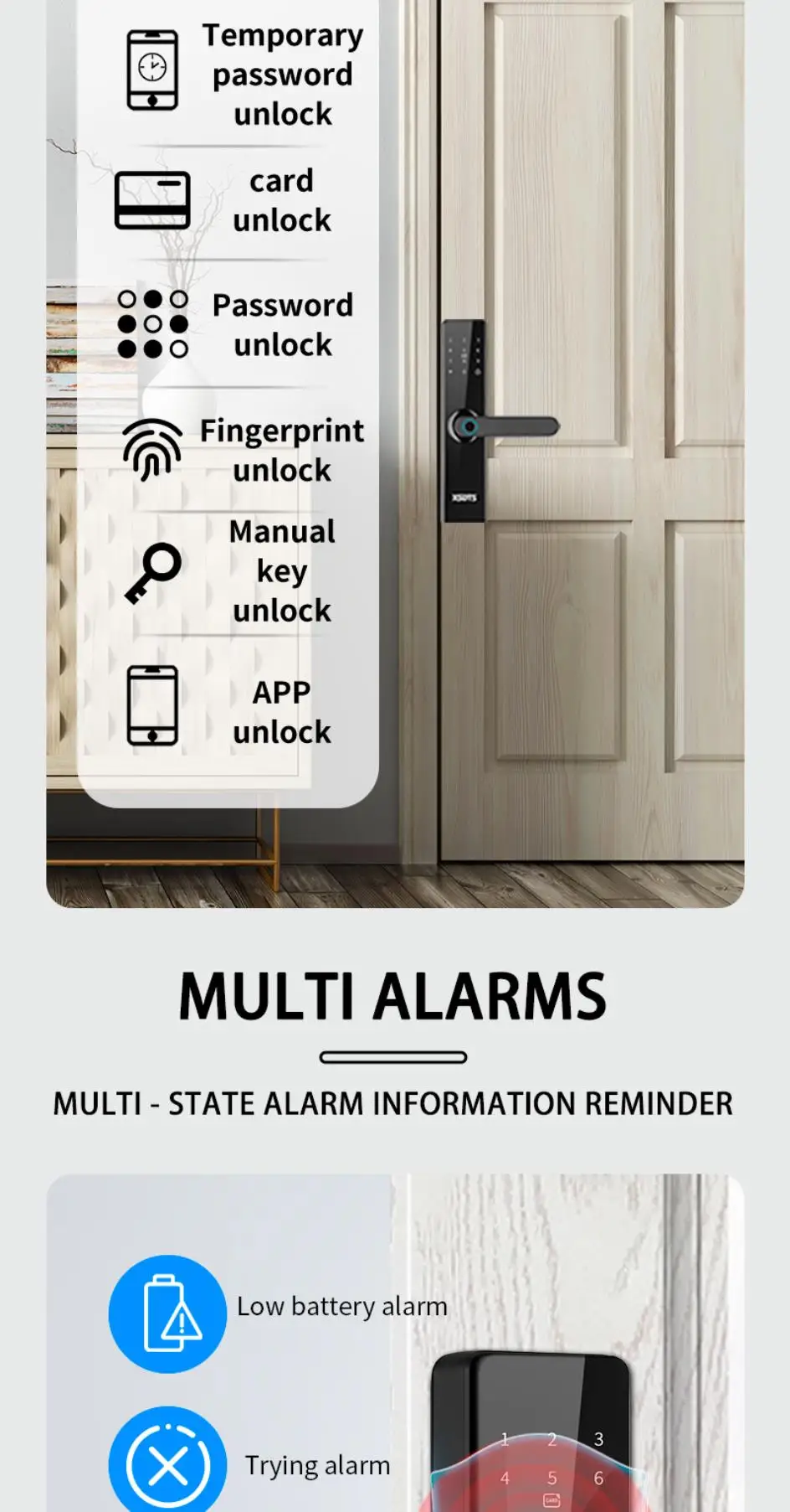 Unlock options: Fingerprints/Key/Password/IC card/App