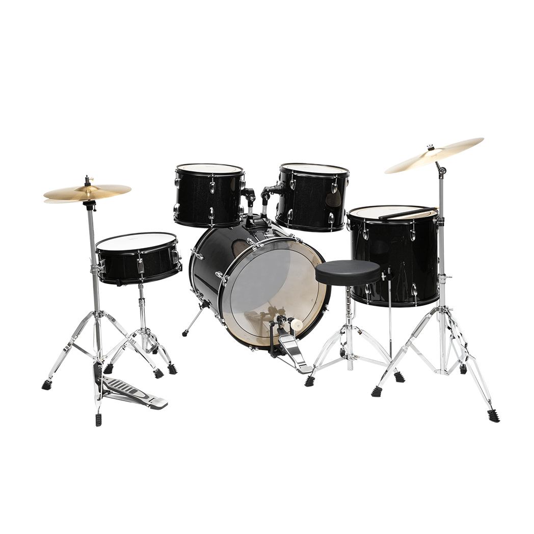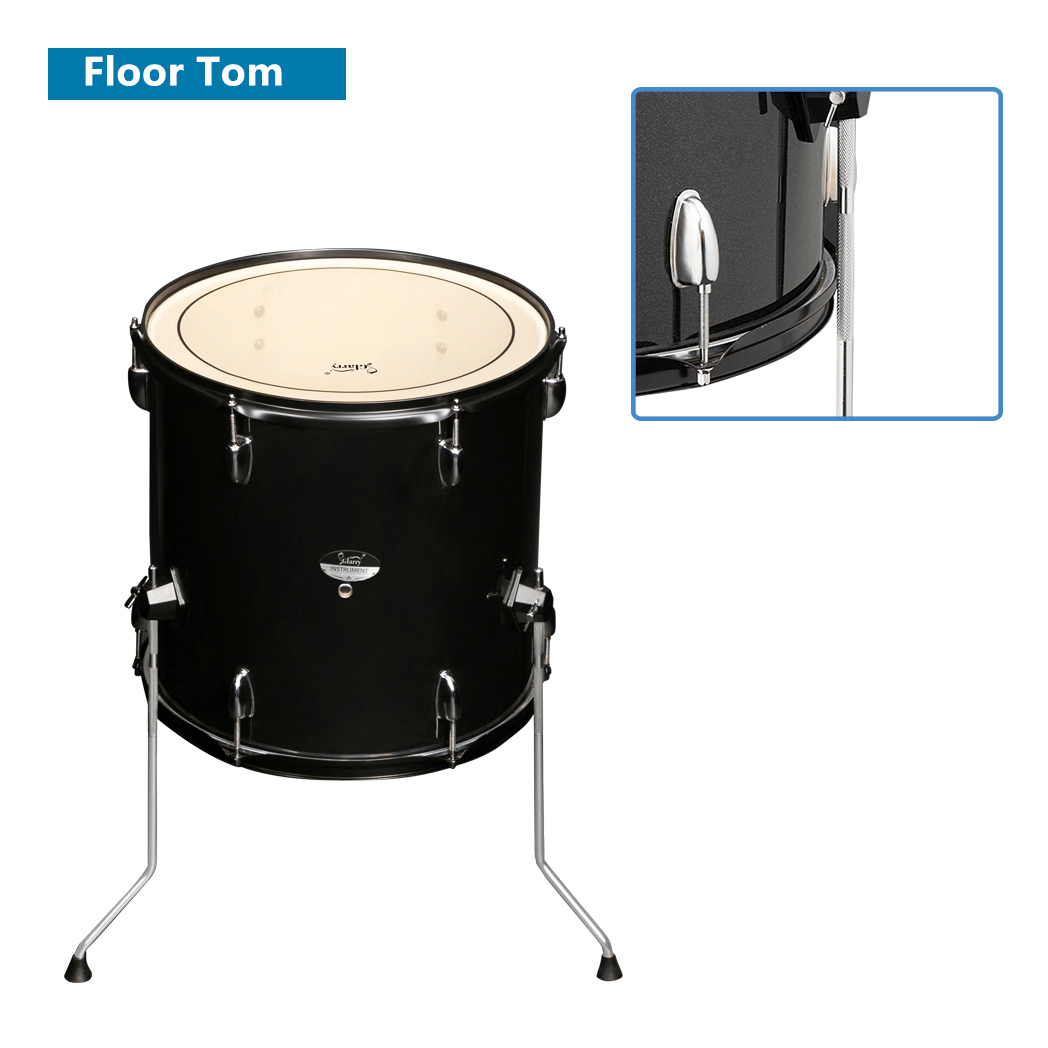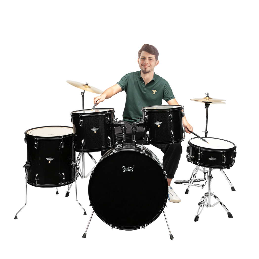 Glarry Full Size Adult Drum Set 5-Piece Black including a 22" x 16" bass drum, 16" x 16" floor tom, 13" x 11" and 12" x 10" tom drum, 14" x 5.5" snare drum, 14" hi-hat cymbals, 16" crash/ride cymbal, all stands, stool, drumsticks, hardware, chain-driven pedals, and drum adjustment key. Perfect for all adult musicians, beginner to advanced, this full-size set provides everything needed for playing and perfecting practice. This drum kit is updated with a double-layer oil drum skin.So our drum has higher hardness and toughness than the single-layer oil skin drum of market. It is more resistant to puncture, more resistant to friction, can withstand high temperature and low temperature.