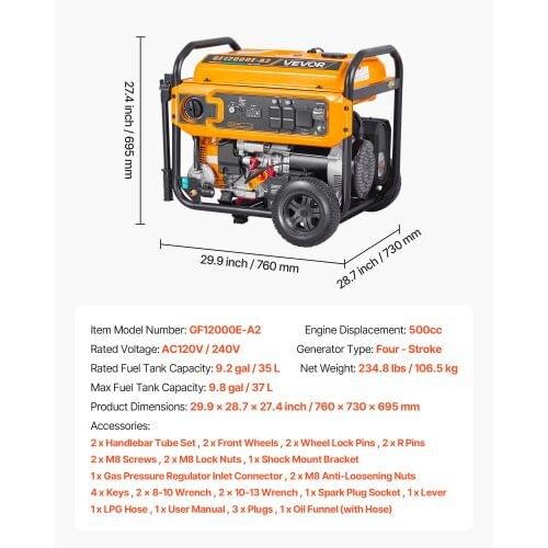 Generator Type: Four-Stroke,Max Fuel Tank Capacity: 9.8 gal / 37 L,Item Model Number: GF12000E-A2,Engine Displacement: 500cc,Product Dimensions: 29.9 x 28.7 x 27.4 inch / 760 x 730 x 695 mm,Rated Fuel Tank Capacity: 9.2 gal / 35 L,Net Weight: 234.8 lbs / 106.5 kg,Rated Voltage: AC120V/AC240V