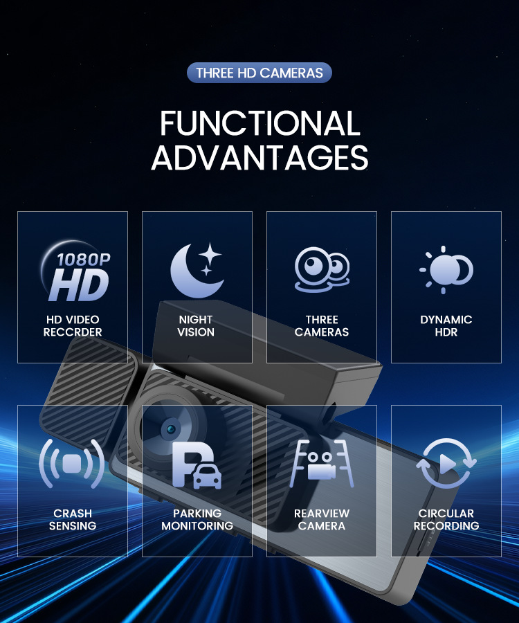 Functions: Bluetooth, GPS navigation, positioning, reversing image, moving speed measurement, motion detection, loop video, parking surveillance, night vision additional lighting, front distance detection, front collision warning, pedestrian collision warning, collision reaction, enhanced night vision, front and rear videos, and short video sharing